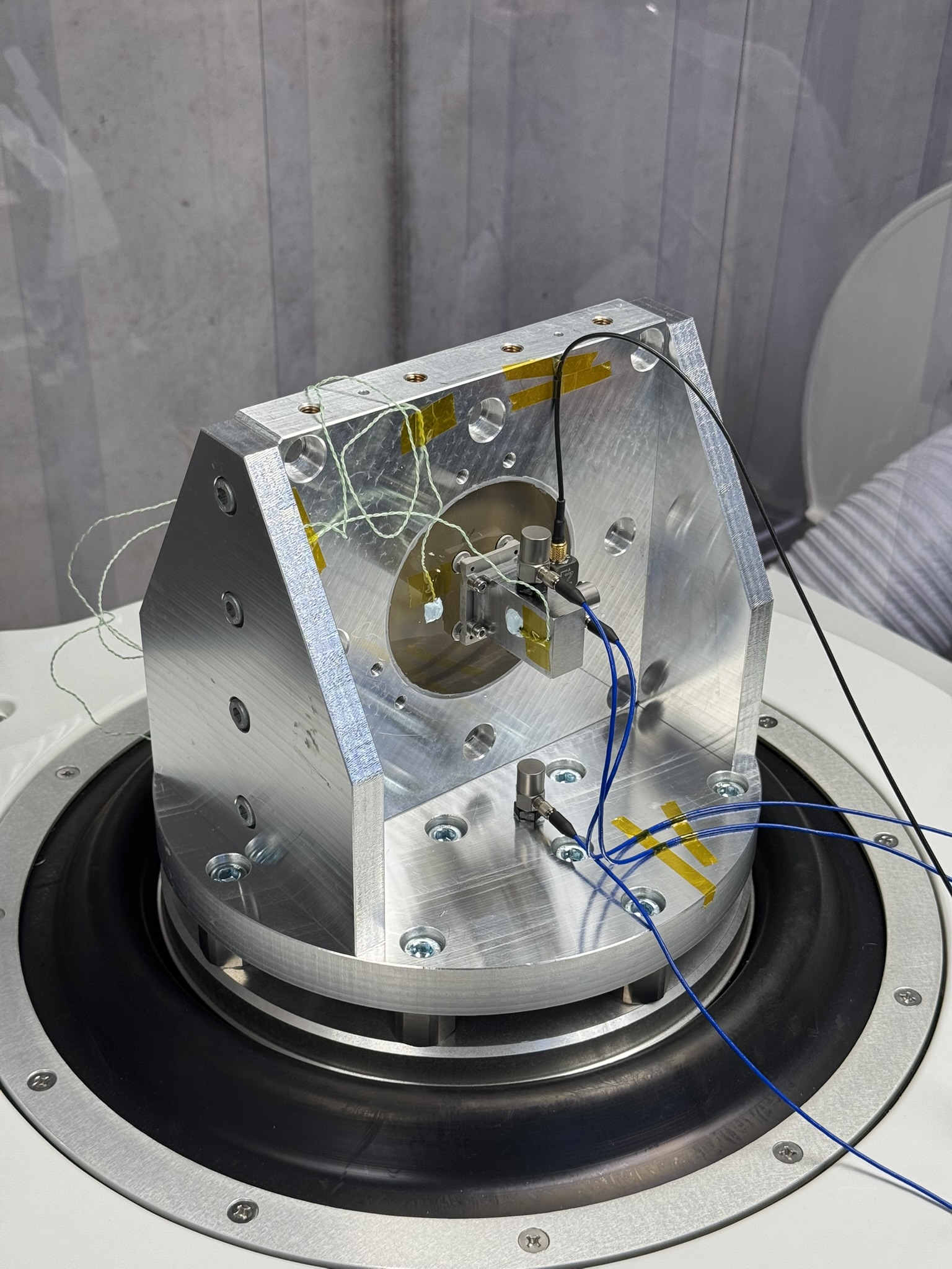 We have successfully complete a vibration test of the LISA Power Monitor unit. In this case the focus of the test was not centered on the unit itself , which was represented only by a mass dummy, but on the interface between the unit and the optical bench. This interface, which is implemented by a „Common Interface Pedestal“ – CIP, uses adhesive bonding towards the Zerodur surface, and a bolted joint to mount the PMON unit itself.